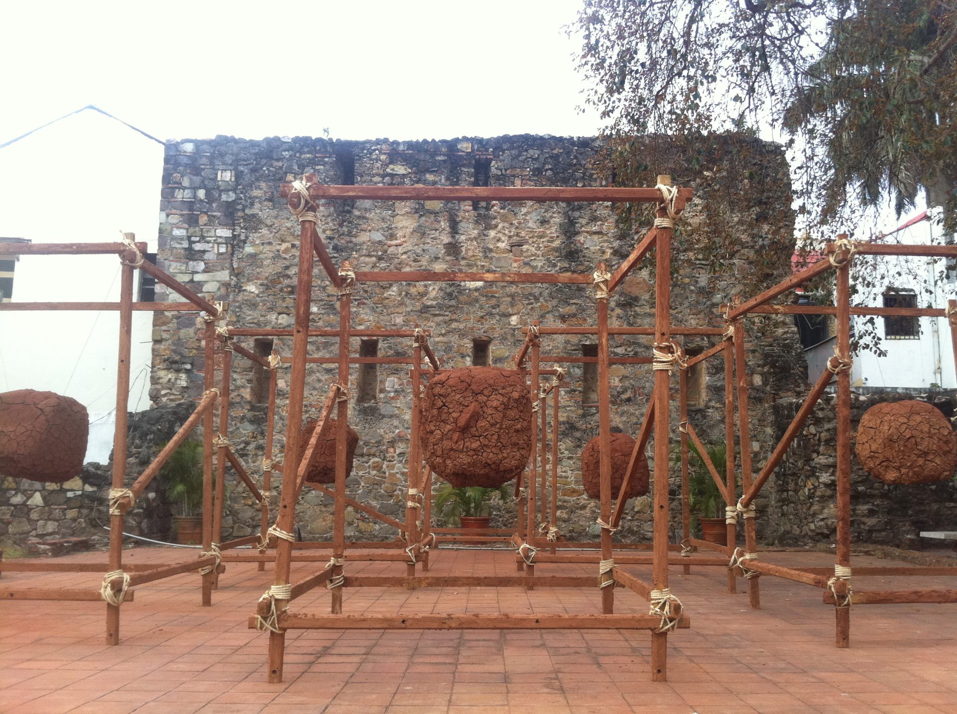 I kind of dig the mystery and awe of bumping into good/ interesting art in the street. When I travel, I always look for those big or small corners of human expression, that space someone stole from a plaza or a wall and transformed it so that people passing by had a reaction, a thought, provoked a smiled or a protest. To throw at you a silent question, make you raise or low an eyebrow. The Bienal in Casco Viejo has been so far a little bit like this. Today I`ll issue my small and humble review from someone who knows absolutely nothing about art. So far, this is my favorite piece. It is at the Arco Chato, and it made me think about the connectivity we have as humans between each other, and the big floating pieces of adobe suddenly became a presence on its own, one very appropriate in a 300 year old colonial town that was built initially on those very materials. I think there was a story in the Popol Vuh that said that the gods have tried humans out of dirt first and that didn´t work out too well, so later they tried carving us on wood. Since any of those creatures had much of a feeling, then they tried corn, which was sacred and therefore the legend comes out that we are the result from that final experiment. Seeing the iron/wood/adobe installation somehow reminded me of the materials we are all made of, which I hope was the point of the whole thing. Maybe I`m wrong! Now, Popol Vuh aside, who is the artist? Silence. There is no sign, no explanation, recognition, big or small or even digital anywhere. Not even at the Biennale website. There is nothing easy to find about the great majority of the guest artists.