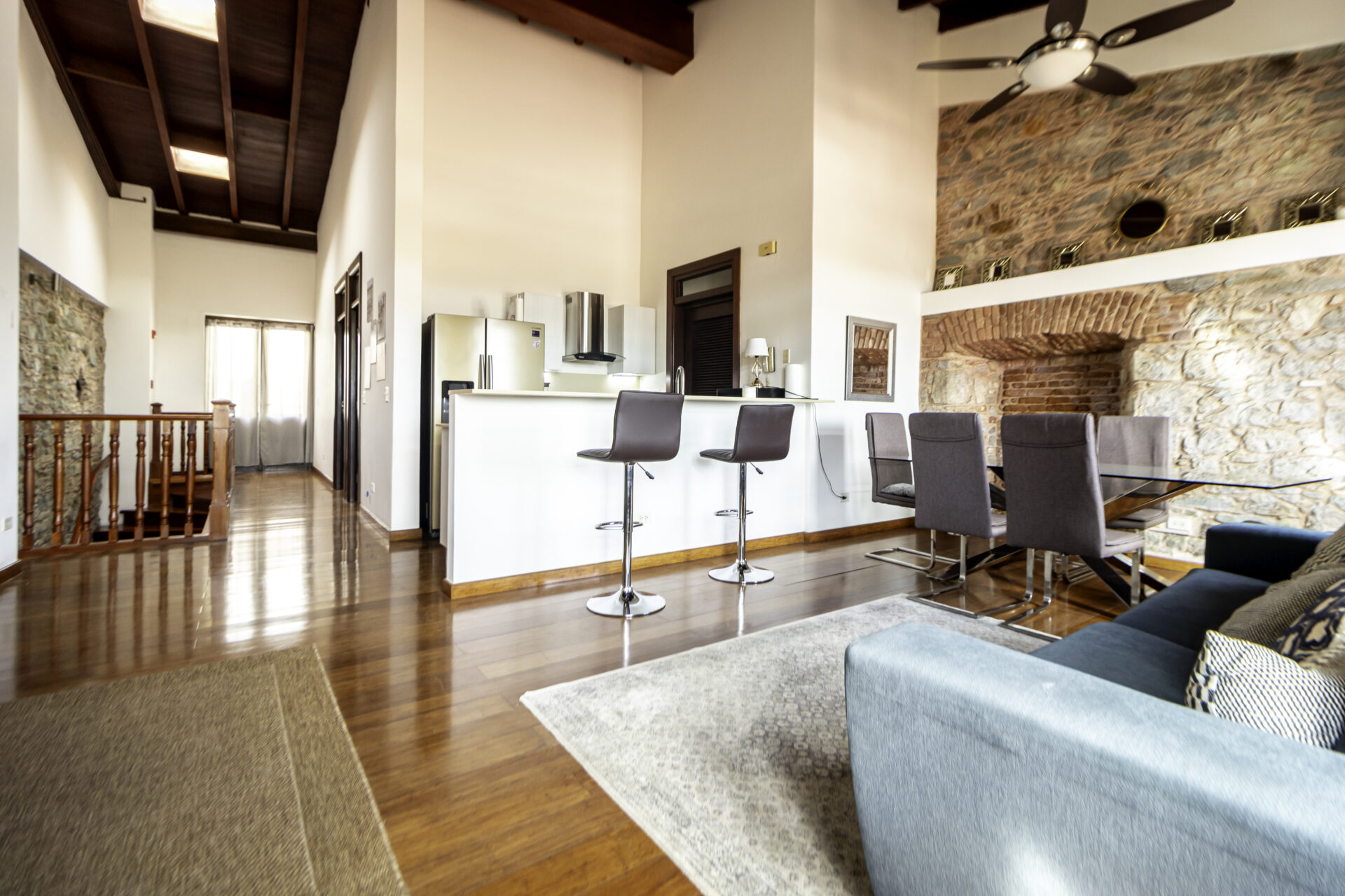 This beautifully furnished unit is located in Portal de Caldas, a restored building just steps from Plaza Herrera in Casco Antiguo. The apartment features a comfortable layout with the living area on one level, a calicanto stone wall with vintage windows, and small water views over Villa Agustina. Enjoy great natural light and cross ventilation, a queen bed, pull-out sofa, full kitchen, and a bathroom with dual access. The small balcony faces a tree-lined area near El Colegio, adding to the charm of this vibrant location.