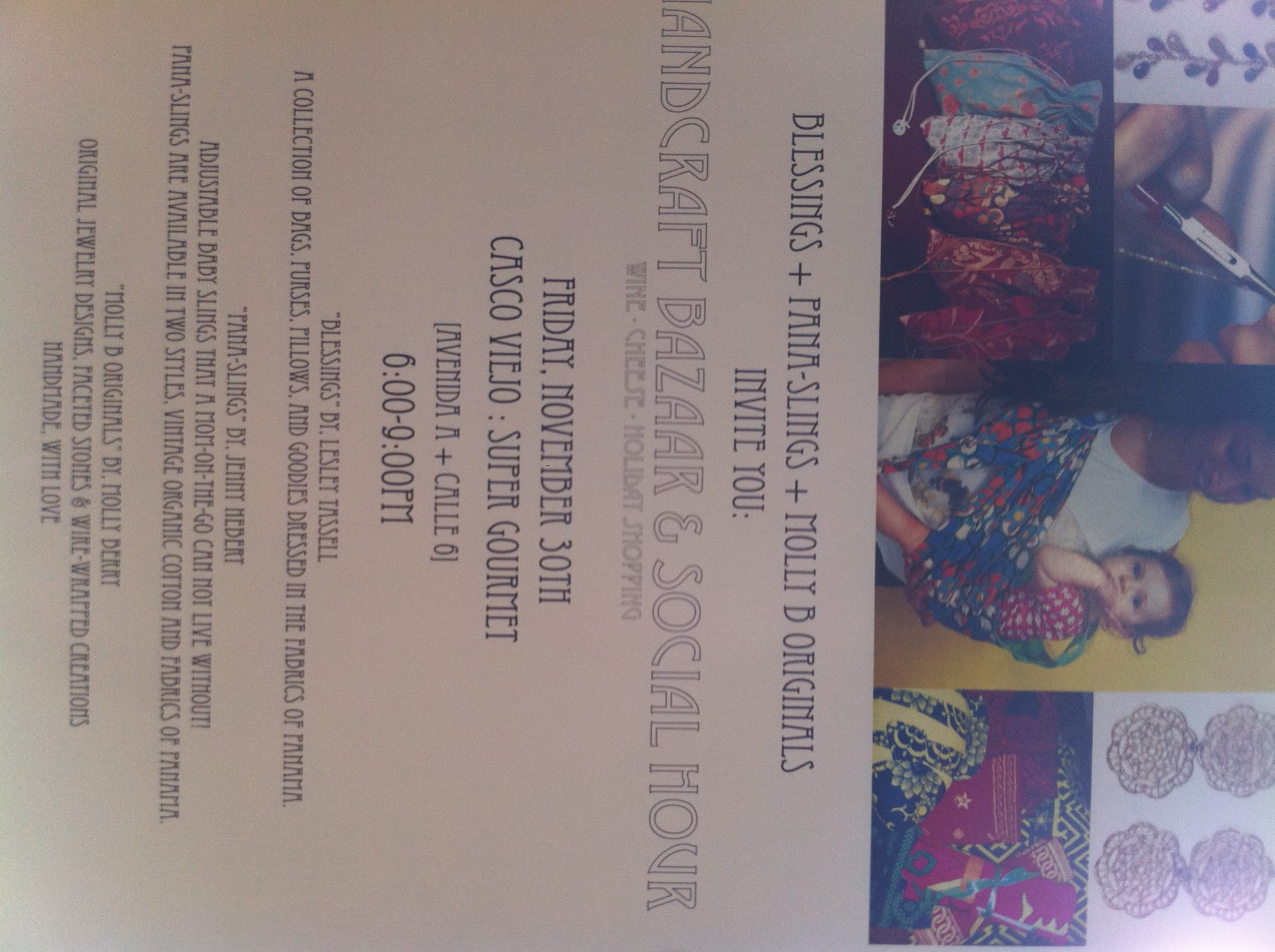 Last Friday, Super Gourmet (“Super G”) had its first Christmas Bazaar. Three artists participated, selling their own product: beautiful jewelry, hand made bags using traditional mola designs and even baby products! People gathered around great cheese and wine, purchasing their Christmas gifts straight from the source. Thanks to Blayne and Jazmina for this initiative!