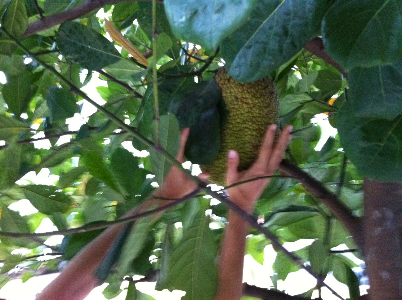 Question No. 2: where else can you find Jackfruit? … in Casco Viejo, Panama… of course! Specifically, right in front of the Benedetti Hermanos building at Central Avenue between 10th and 11th. There are two beautiful trees there and are right now bearing fruit. And what a fruit! check this photo out. Consider those are my hands in the photo!